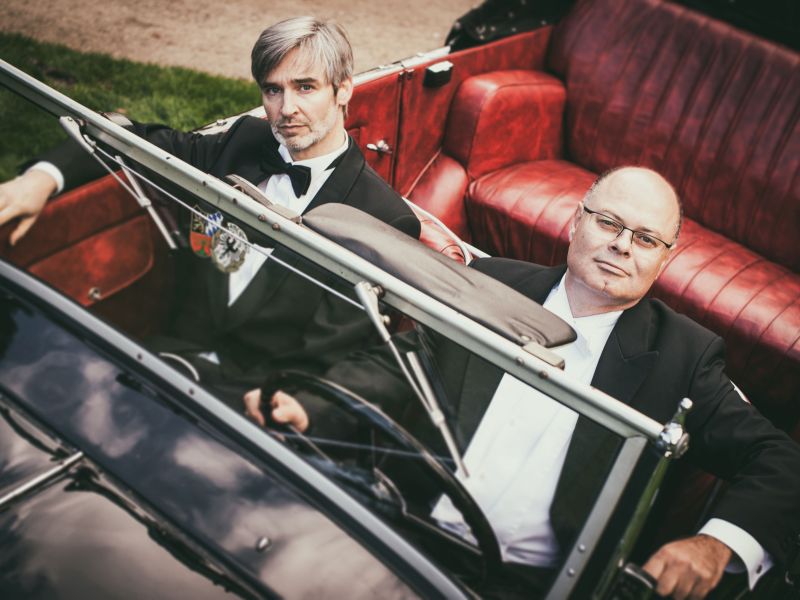 Zwei Musiker des Ballhausorchesters in Frack und Fliege in einem Oldtimer-Cabriolet, © Ballhaus Orchester