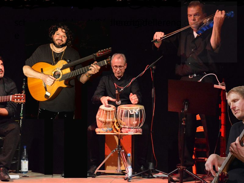 Hier vereint sich der charakteristische spanische Gitarrenklang mit facettenreichen Improvisationen von Violine und Jazzgitarre und dem perkussiven Spektrum von Cajon, Tablas und Schlagzeug.