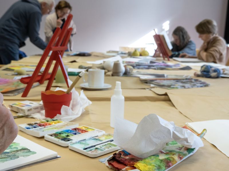 Unter fachlicher Anleitung werden Handwerklichkeiten vermittelt, gelernt, ausprobiert und je nach Vorerfahrungen vertieft. An acht Vormittagen – gestärkt mit Kaffee und Brezel – wird vor allem mit Acryl- und Aquarellfarben gearbeitet. Hin und wieder geht es nach draußen, um dort Motive in den Blick zu nehmen und als Skizze auf das Papier zu bringen. Leichtigkeit und Freude am Malen stehen im Vordergrund.