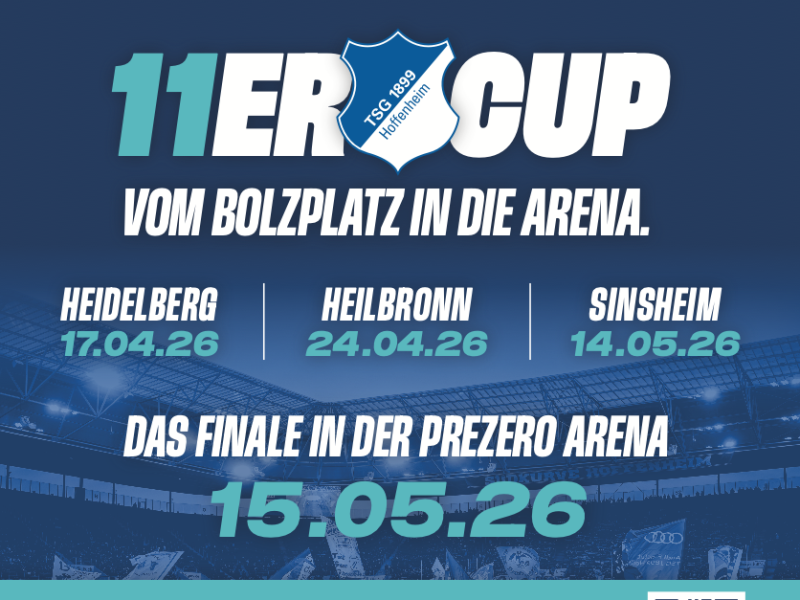 Die TSG Hoffenheim lädt in diesem Jahr erstmals zum Elfmeterturnier ein – dem TSG-11er-Cup. Die Eventreihe macht Station in Heidelberg (17. April), Heilbronn (24. April) und Sinsheim (14. Mai). Die besten Teams der Vorrunden sichern sich das Ticket für die Finalrunde in der PreZero Arena am 15. Mai in Sinsheim.